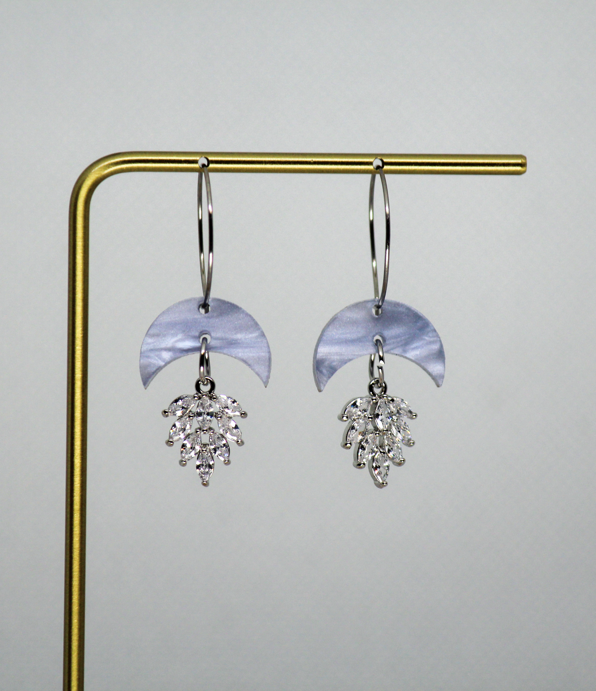 Handcrafted acrylic moon charm adorned with a sparkling cubic zirconia leaf detail. This delicate piece captures celestial elegance with artisanal charm, perfect for personalizing bracelets, necklaces, or jewelry projects. Available in three stunning color varieties to match your unique style. Each charm reflects careful attention to detail, bringing a touch of nature-inspired magic to your collection.
