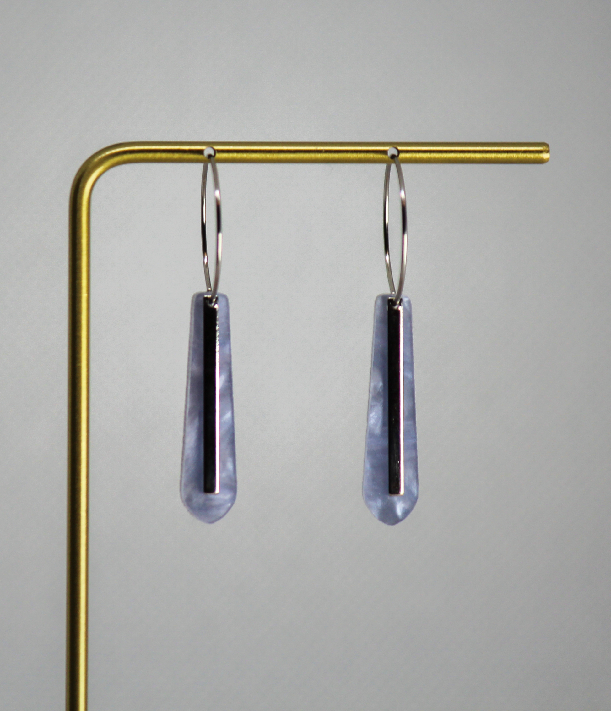 These striking hoop earrings blend modern design with artisanal charm. Each pair features a vibrant blue acrylic bar layered with a gleaming silver-plated bar in front, creating dimensional depth and visual interest.