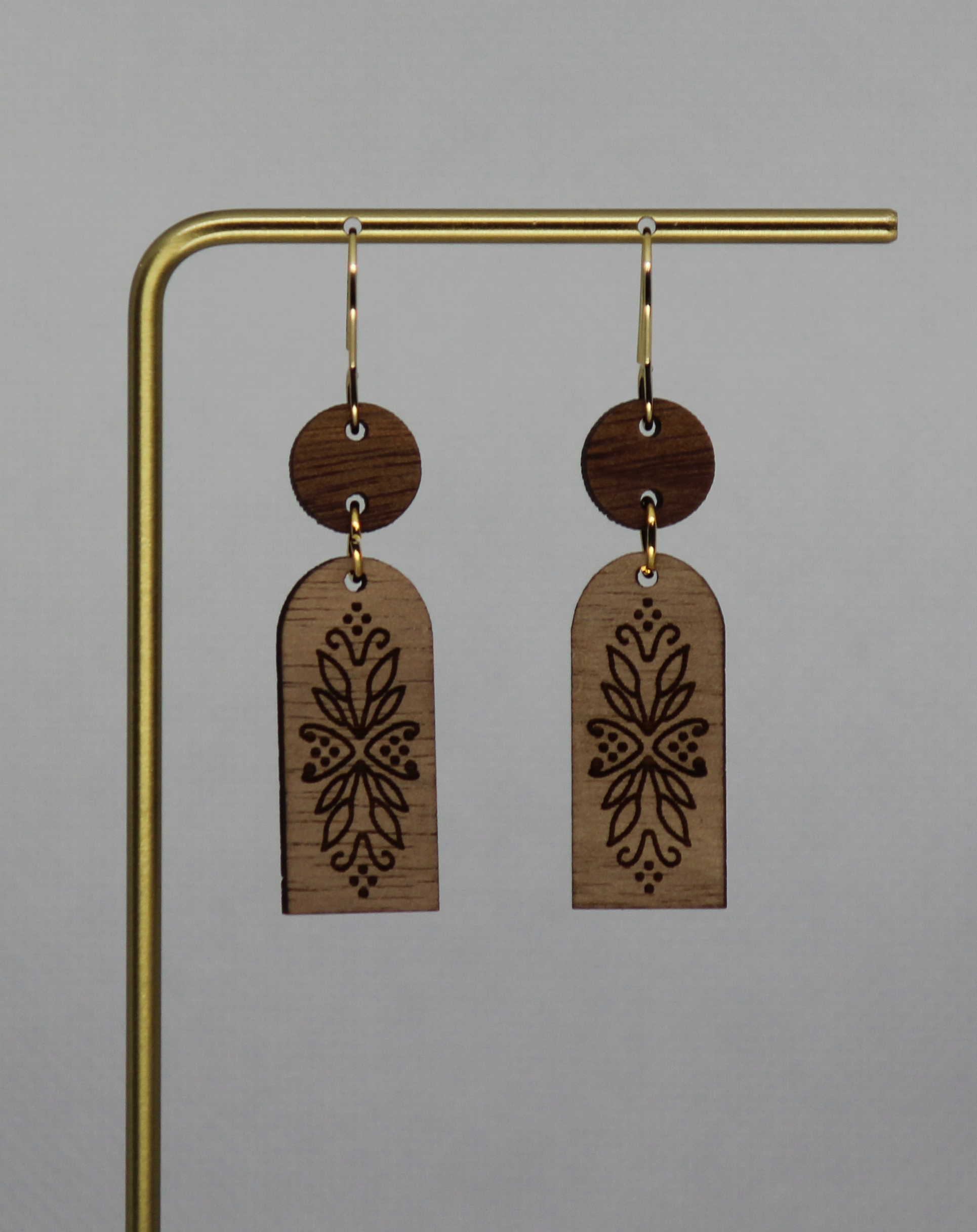 These striking earrings combine natural wood elements with artisanal detail. Each pair features a smooth wooden circle paired with an arched wooden piece adorned with a delicate burned-in foliage pattern that adds organic texture and visual interest.