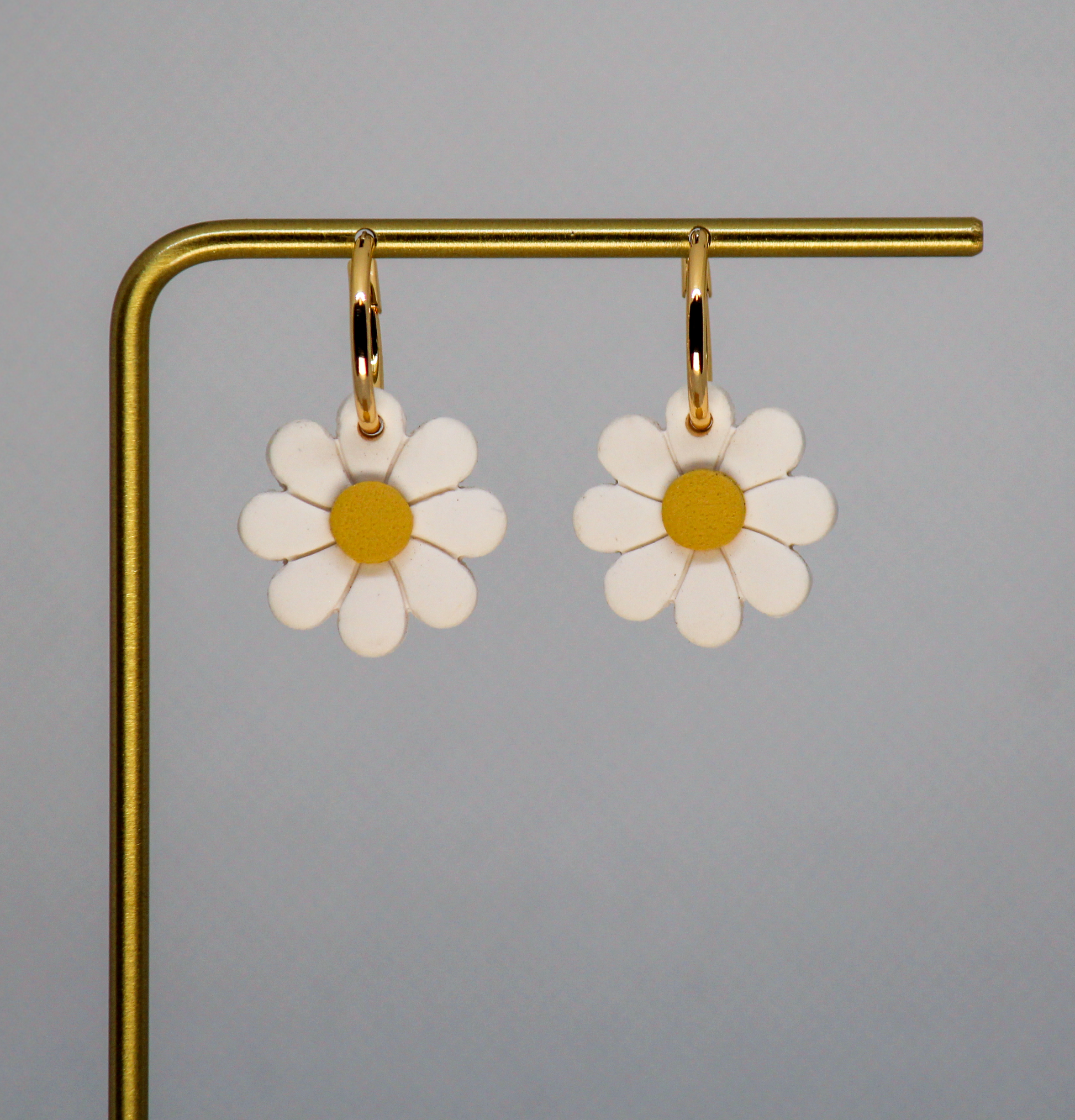 Delicate 14K gold-plated huggie earrings adorned with charming polymer clay daisies. Each pair is crafted with care, featuring a minimalist design that sits closer to the ear for all-day comfort. Lightweight and versatile, these huggies transition effortlessly from casual to dressed-up occasions.